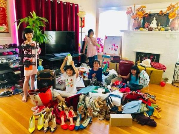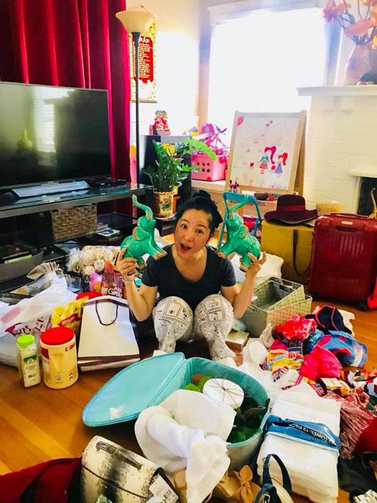 Phòng khách rộng rãi nên đồ đạc được bé Nguyệt Cát dọn ra đây để sắp xếp vào vali.