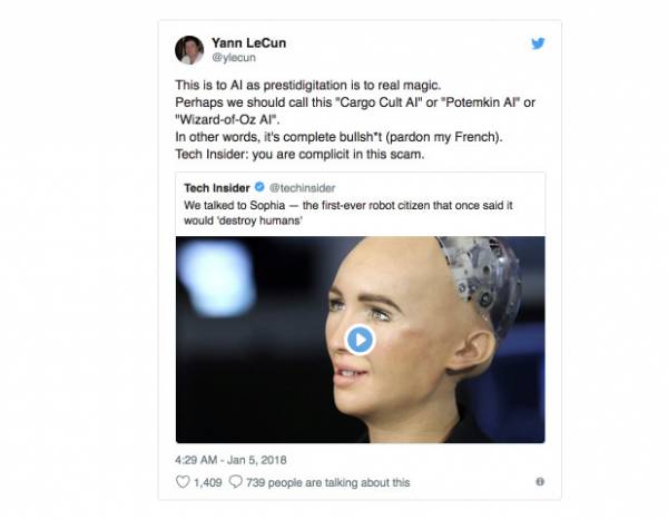 Yann LeCun, người đứng đầu bộ phận nghiên cứu về AI của , được đánh giá là chuyên gia đầu ngành về lĩnh vực trí tuệ nhân tạo, cho rằng "Sophia là trò lừa gạt".