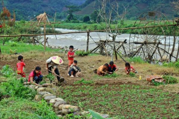 Người dân Phiêng Tiên dựng cọn nước và trồng hoa bên suối Nậm Mu. Ảnh: Thụy Văn