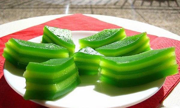 Nguyên liệu: Phần bánh màu xanh: 200g bột năng, 30g bột gạo, 150-200g đường, 1 bó lá dứa. Phần bánh màu vàng: 50g bột năng, 50g bột gạo, 50g đậu xanh không vỏ, 100g đường, 1 lon nước cốt dừa.