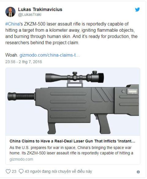 Theo SCMP, Trung Quốc đã phát triển súng laser phi sát thương ZKZM-500 bắn ra chùm tia mắt thường không thể nhìn thấy, có thể xuyên qua kính cửa sổ.