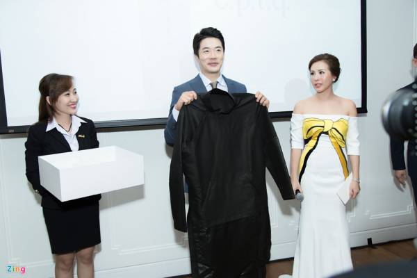 Kwon Sang Woo được Hoa hậu Thu Hoài, người đã mời anh sang Việt Nam lần này, tặng chiếc áo dài dành cho nam giới màu đen sang trọng.