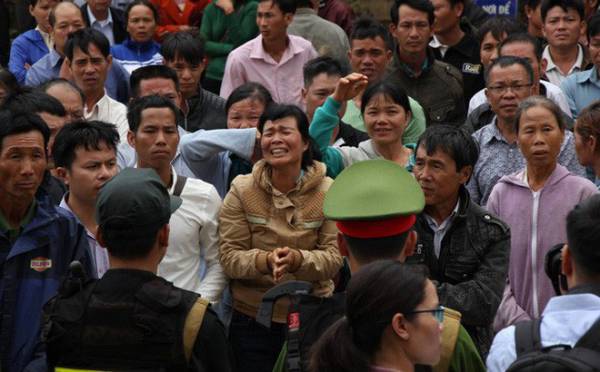 Người thân Đặng Văn Hiến quỳ khóc trước toà. Ảnh: Xứ Thanh