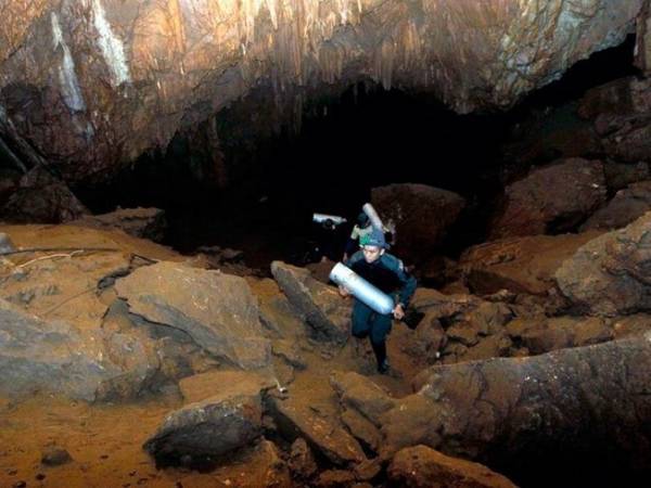 Một thợ lặn mang bình khí tới nơi 13 thành viên đội bóng mắc kẹt. Ảnh: EPA