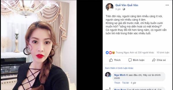 Ngay sau đó, trên trang cá nhân, nữ ca sĩ hiện đang làm mẹ đơn thân viết một status đầy ẩn ý: "Trên đời này, người càng làm nhiều càng ít nói, người càng nói nhiều càng ít làm. Không sợ giả dối trước mắt, chỉ thấy buồn cười muốn hỏi? "Sống mà diễn hoài có mệt không?" Có người thay đổi tốt hơn từng năm, có người vẫn luôn trẻ mãi trong thân xác nhiều tuổi".