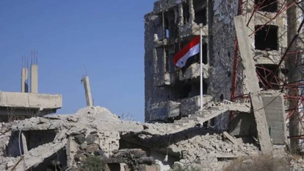 Cờ Syria tung bay trên một toàn nhà đổ nát tại Daraa. Ảnh: CBC.