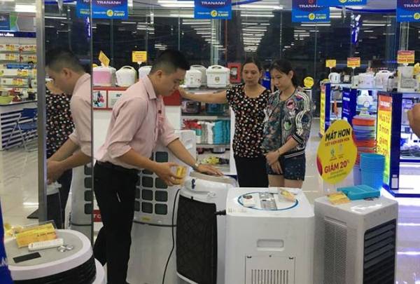 Trên tuyến đường Nguyễn Hữu Thọ (quận Hải Châu), hầu hết các siêu thị điện máy đều trưng các loại quạt ra phía mặt để khách hàng tiện xem và lựa chọn. Tại siêu thị Đ.M.X, nhân viên bán hàng cho hay người dân tới mua các loại quạt suốt ngày, chủ yếu là quạt hơi nước, quạt điều hòa. Mỗi ngày bán gần 50 chiếc quạt, tăng gấp hai, ba lần trước đó. Trong khi đó, tại siêu thị V.T., một số loại quạt điều hòa có tầm giá từ 4 - 7 triệu đồng cháy hàng, khách phải đặt trước một vài ngày mới có.