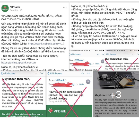 Ngoài ra, VPBank cũng cảnh báo khách hàng về tình trạng lừa đảo chiếm đoạt tiền qua mạng. Cụ thể, VPBank cho biết gần đây NH có nhận được đề nghị hỗ trợ từ một số khách hàng bị lừa chuyển tiền cho đối tượng xấu. Có trường hợp khách hàng đến rút toàn bộ sổ tiết kiệm để nộp tiền vào một tài khoản lạ và đã được nhân viên giao dịch kịp thời cảnh báo khi phát hiện dấu hiệu lừa đảo.
