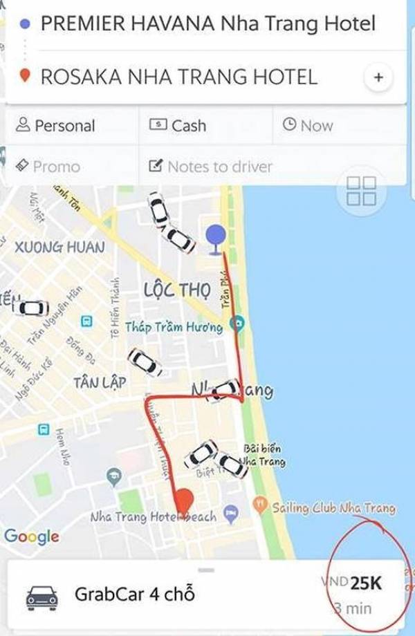 Ttền đi xe GrabCar từ khách sạn Havana đến Rosaka chỉ mất 25.000 đồng
