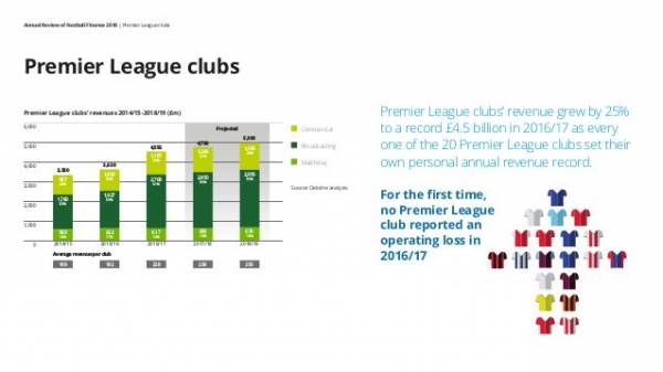 Theo con số từ báo cáo tài chính bóng đá hàng năm của Deloitte, doanh thu của Ngoại hạng Anh đang tăng đều qua các mùa giải. Tại mùa 2017/18, họ đạt mốc doanh thu 4 tỷ 780 triệu bảng tăng 228 triệu so với mùa giải trước đó. Và mục tiêu doanh thu của giải Ngoại hạng đề ra cho 2018/19 là con số tròn 5 tỷ bảng.