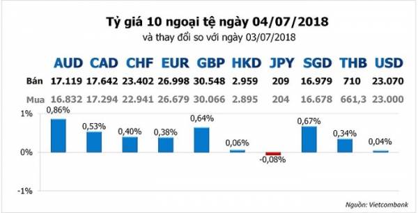 So với sáng ngày 3/7, Vietcombank, Sacombank, VPBank điều chỉnh giá USD lên 10 VND ở cả 2 chiều. MB tăng 15 VND (mua vào). VIB tăng 5 VND (mua vào) và 15 VND (bán ra). Techcombank tăng 10 VND (mua vào) và giảm 5 VND (bán ra). BIDV và Vietinbank giảm lần lượt 15 VND và 3 VND ở cả 2 chiều.