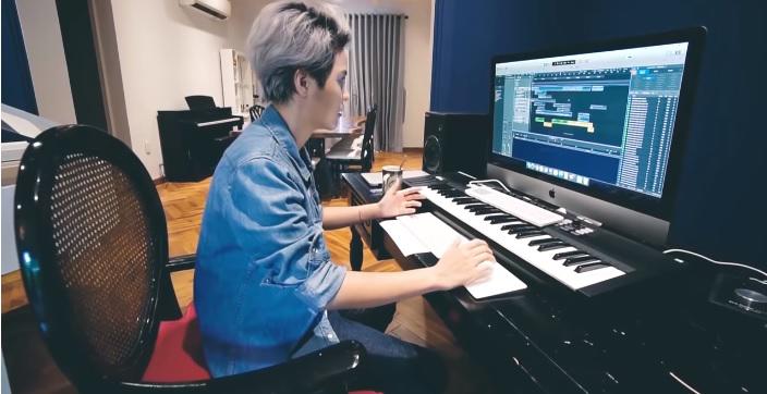 Vũ Cát Tường dành một không gian riêng cho công việc, đó chính là khu vực sáng tác với Piano và dàn thiết bị thu âm hiện đại, chuyên nghiệp.