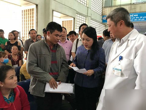 Bộ trưởng Nguyễn Thị Kim Tiến hỏi thăm bệnh nhân chờ khám tại Bệnh viện Chợ Rẫy