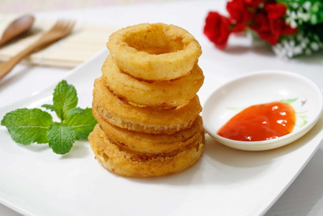 - Bước 5 : bắc chảo dầu lên bếp đun nóng dầu thì vặn lửa nhỏ vừa, thả từng khoanh hành tây vào chiên vàng giòn 2 mặt rồi vớt ra đĩa có lót giấy thấm dầu, khi ăn chấm tương cà hoặc tương ớt đều rất ngon.