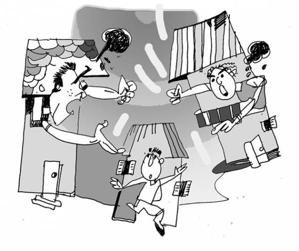 Sáng chủ nhật ở góc phố tưng bừng cảnh khẩu chiến. Hóa ra, trận cãi nhau của mấy anh chị em trong nhà. Chắc là đã có cãi nhau trong nhà rồi mới kéo ra sân chửi nhau, khiến cả phố đều nghe. Nào là anh chị em ruột rồi có thêm em dâu, chị dâu, anh rể… Họ dùng toàn là từ tục tĩu pha vào câu la hét. Chuyện là, cha mẹ đã chia cho các con, ai cũng có nhà riêng, đất riêng. Người con út giữ nhà từ đường có khoảng sân hơi rộng, đang cho thuê giữ xe hơi, rửa xe. Khi xưa không sao, nay đất đai có giá, anh chị xúm lại đề nghị chia cho đều hoặc là bán chia tiền mặt. Thế là cãi thôi, dù nhà ai cũng khá giả. Chuyện còn hứa hẹn ly kỳ vì ai cũng hăm he kiện ra tòa, bất chấp chuyện anh em chung một mẹ sinh ra.