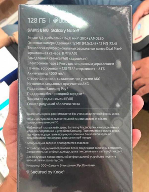 Một ngày sau khi lộ video giới thiệu sản phẩm, Galaxy Note9 tiếp tục bị lộ hình ảnh hộp đựng bản thương mại chuẩn bị bán ra thị trường. Đây là model có dung lượng 128 GB và bán ra ở thị trường Nga. Mặt sau của hộp đựng tiết lộ đầy đủ cấu hình của sản phẩm.