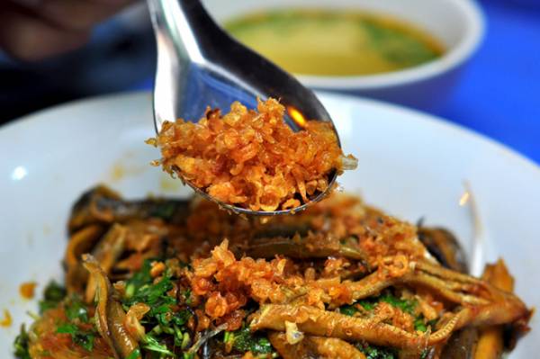 Món ăn được yêu thích nhất của quán là miến lươn trộn. Miến trộn với lạc, rau sống thêm lươn chiên giòn rụm và nướng dùng nóng hổi rất vừa miệng.
