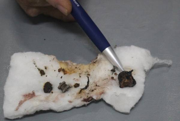Đến chiều 8.8, bệnh nhân T. đã được đội ngũ y bác sĩ Khoa Nội tổng hợp tiến hành nội soi, gắp các dị vật gồm: bánh xe quẹt gas, một cục sắt gỉ sét (kích thước 2 x 2 cm), lưỡi câu sắt cùng nhiều dị vật sắt vụn nhỏ nằm trong phế quản của hai bên phổi bệnh nhân ra ngoài.