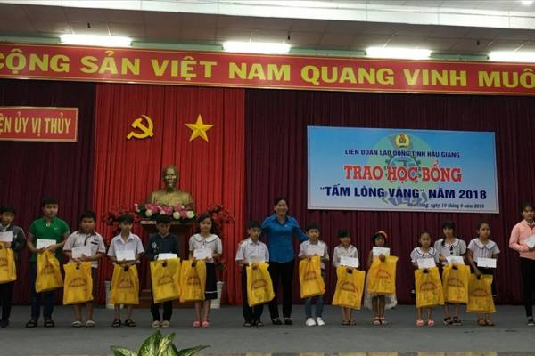 Chủ tịch LĐLĐ tỉnh Hậu Giang - Lê Thị Thanh Lam trao quà cho nhiều học sinh học giỏi.Phấn khởi khi nhận được suất học bổng trị giá 500.000 đồng từ Quỹ học bổng “Tấm lòng vàng”, em Nguyễn Thị Minh Thư, học sinh Trường Tiểu học Chu Văn An, thành phố Vị Thanh, : “Bước vào năm học mới, cháu được các cô, chú lãnh đạo LĐLĐ tỉnh tạo điều kiện, giúp đỡ bằng những suất học bổng. Đây là món quà ý nghĩa và là động lực tiếp thêm sức mạnh cho cháu vượt khó học tập, trở thành công dân có ích cho xã hội trong tương lai. Đáp lại sự quan tâm đó, cháu hứa sẽ quyết tâm ra sức rèn luyện, học tập thật tốt để không phụ lòng các cô chú đã dành cho”.