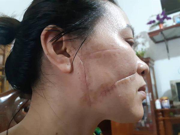 Sau khi điều trị, trên mặt chị Oanh vẫn chằng chịt vết dao cắt.