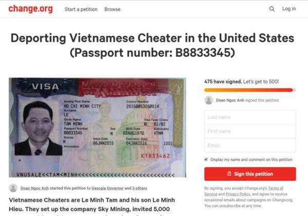 Bản kiến nghị trên website Change.org yêu cầu Mỹ trục xuất Lê Minh Tâm, giám đốc Sky Mining đã nhận được hơn 500 chữ ký.