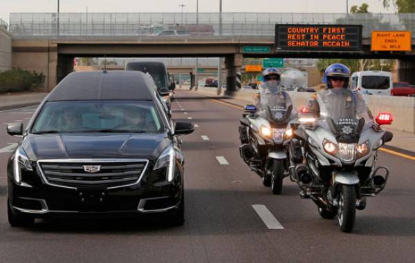 Đoàn xe chở thi hài Thượng nghị sĩ John McCain từ Tòa nhà Quốc hội bang Arizona. Ảnh: Reuters