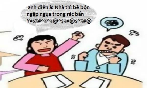 - Vợ: Anh điên à! Nhà thì bề bộn ngập ngụa trong rác bẩn, cả tuần nay em cũng chưa đi chợ lấy gì mà nấu ăn đãi khách. Còn bát đĩa suốt mấy ngày anh có chịu rửa. Thế mà anh còn dầy mặt mời bạn về nhà à?