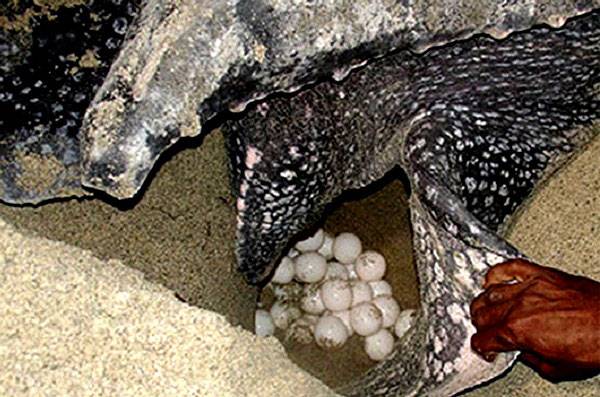 Sau 7 giờ tối, khi nước lên cao, rùa mẹ bắt đầu thấp thoáng trên làn sóng biển gần bờ, chậm rãi bò vào bãi cát mịn gần các lùm cây để đẻ trứng. Rùa sẽ dùng hai chân trước đào tổ, sau đó dùng hai chân sau đào một lỗ sâu chừng 50 - 60cm, rộng khoảng 20cm và bắt đầu đẻ trứng. Trong ánh đèn pin sáng nhẹ, du khách sẽ được thấy từng quả trứng rùa tròn và trắng như bóng bàn rơi xuống lỗ. Sau khi lấp xong tổ trứng, rùa biển lại tiếp tục dùng chân trước lấp xung quanh ổ với chiều dài 5 - 6m để xóa dấu vết và ngụy trang cho tổ trứng của mình. Một rùa mẹ trung bình đẻ được khoảng 80 trứng, nhưng cá biệt có con đẻ tới 200 trứng.