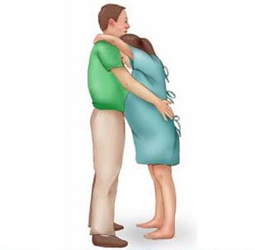 Sản phụ có thể tựa vào chồng hoặc người thân trong tư thế đứng thẳng, một tay vòng qua cổ chồng hoặc người thân. Khi cơn đau dữ dội, mẹ bầu hãy nhẹ nhàng đu đưa người như đang nhảy một điệu nhảy nhẹ nhàng và nhờ chồng hoặc người thân massage lưng.