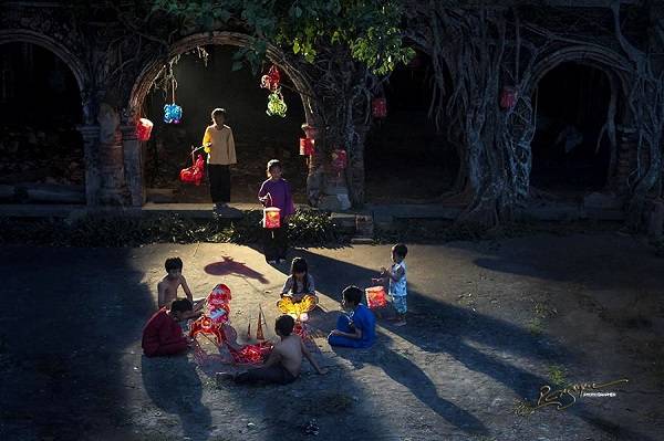 Như hôm nay, trung thu cận kề, Sài Gòn vẫn mưa trắng trời. Người lớn dường như biết mình đã quên cái gì, nên ngồi trước cửa đốt đèn cầy, ăn bánh, gọi điện cho ba má hỏi han. Má kể, mới mùng một, mùng hai đã mưa úng đất, úng cát. Mình xui má làm mái che hết sân, má nói để chừa đó ngó đất ngó trời, mưa thì mưa, chứ tối thế nào cũng tạnh, trăng lên. Trăng lên treo giữa mảnh sân giờ đã bớt rộng, giữa thênh thang đó, mình liệu sẽ nhớ được bao nhiêu gương mặt ngày xưa túm tụm chờ ngọn lửa của anh Hai. Mình tắt điện thoại buồn buồn, ngắm lồng đèn vải đỏ bên chùa rực một màu ướt thẫm. Mười mấy năm ở phố, bỏ quên một khoảng sân, bỏ quên mười mấy mùa trăng