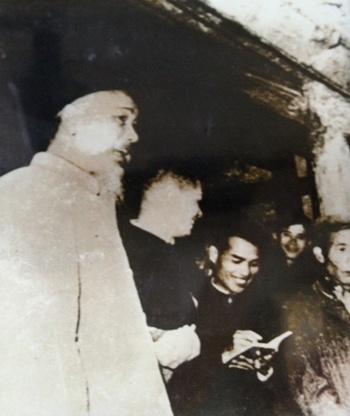 Nhà văn Sơn Tùng đang ghi chép lời Bác Hồ nói chuyện với nhân dân thôn Lỗ Khê, xã Liêu Hà, huyện Đông Anh, Hà Nội vào sáng mồng một Tết Giáp Thìn 1964 (Ảnh tư liệu gia đình)