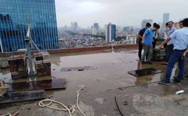Một bên cần trục bên trái của Gondola tuột ra khỏi bộ phận đối trọng rơi từ tầng 16 xuống mặt đường Lê Văn Lương.