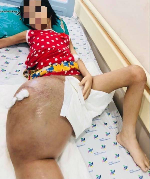 Mắc bệnh ung thư xương, chân bé gái sưng to hơn cả người. Ảnh: BH.