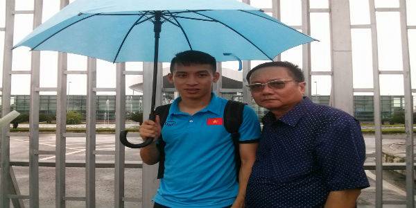 Ông Nguyễn Văn Toàn, cha đội trưởng Văn Quyết và tuyển thủ Đỗ Hùng Dũng đứng ngoài sân bay chờ đón Olympic Việt Nam. Ảnh: Tùy Minh
