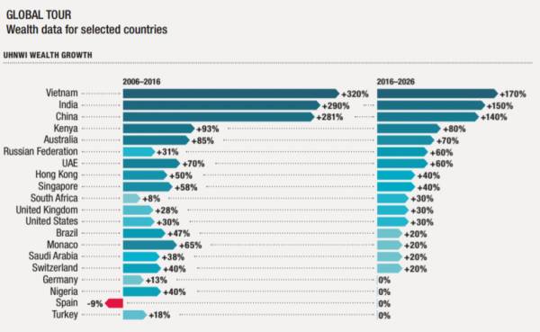 Theo báo cáo The Wealth Report (do đơn vị tư vấn bất động sản Knight Frank thuộc Vương quốc Anh công bố), nhóm người siêu giàu có tài sản ròng cực cao (UHNWI) ở Việt Nam đã tăng trưởng đến 320% - tỷ lệ cao nhất thế giới từ năm 2006 đến 2016, gấp hơn 10 lần so với Mỹ (30%).