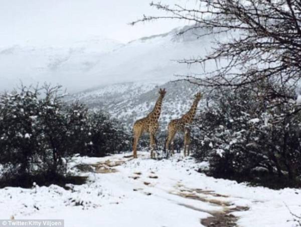 Bức ảnh do Kitty Viljoen, một cư dân sống ở Eastern Cape chụp lại cho thấy cảnh những con voi tận hưởng tuyết trắng ở Sneeuberg. Viljoen cũng chụp được ảnh hươu cao cổ ở Karroo, khu vực khô cằn điển hình ở Nam Phi.