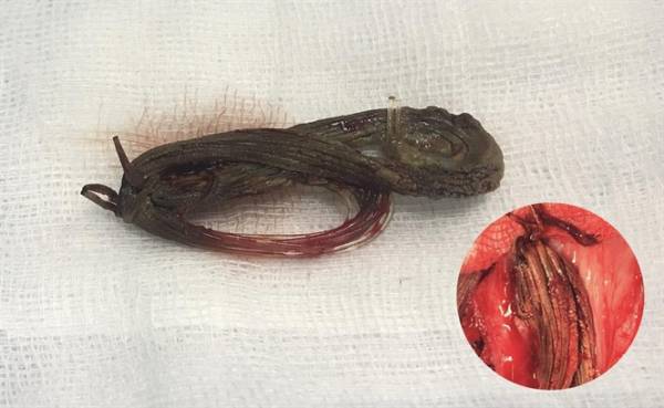 Trong quá trình phẫu thuật thám sát đường tiểu, ê kíp phẫu thuật phát hiện một vật lạ đã ăn sâu xuyên qua thành niệu đạo đến sát vách thể hang của dương vật. Dị vật được lấy khỏi niệu đạo là một đoạn dây cước đã đóng sỏi xung quanh thành khối có kích thước 2,5cm x 6cm. Lúc này người bệnh mới nhớ là năm 14 tuổi, trong lúc ở nhà một mình đã “nghịch dại” tự nhét cuộn cước làm dây câu cá vào niệu đạo vì cảm giác… “thích thích”. Sợi cước chui sâu vào bên trong niệu đạo, không thể lấy ra được. Sau đó, vì ngại nên người bệnh chỉ biết chịu đựng trong lặng thầm cho đến khi hôm nay...