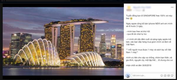 “Tuyển đồng bọn đi Singapore free 100% vé máy bay, ngày công bố bán iPhone new, anh em mình sẽ đi trước 3 ngày. Mình bao free vé khứ hồi, qua đó ăn chơi tự túc. Mình chỉ cần đêm cuối và sáng ngày Apple mở bán, các bạn xếp hàng mua giùm mình và đem về Việt Nam. Mỗi người mua được một máy và xách tay về Việt Nam một máy. Mình ưu tiên cho cặp vợ chồng, nhóm bạn thân, cả gia đình, nguyên công ty, một tập thể.... đi chung cho vui” chủ cửa hàng chuyên bán smartphone trên đường Lê Hồng Phong, đăng tải lên trang Facebook cá nhân của mình.