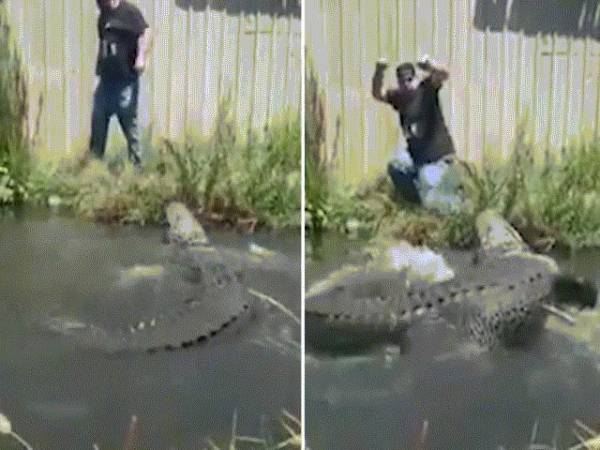Người đàn ông đang tóm đuôi con cá sấu, thì bị con vật khổng lồ quay lại tấn công.