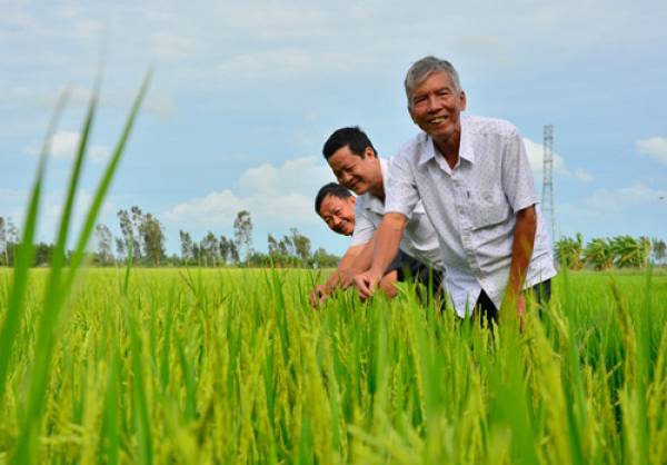 Ông Hùng cùng các cán bộ Hội ND huyện Giồng Riềng thăm ruộng lúa của gia đình trong vụ hè thu 2018. Ảnh: NQ