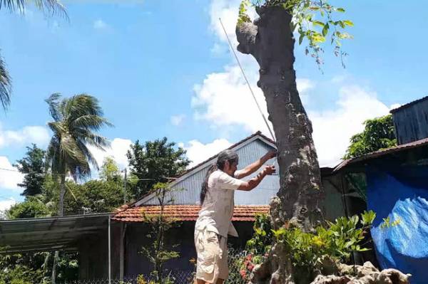 “Trước mắt thì tôi muốn tạo tiểu cảnh cho nó, tôi biết là tán cây này sau đó sẽ ra 2m hoặc hơn 2m ngoài, nó buông dây đất và cộng với bộ rễ xem y như hòn non bộ thiên nhiên, trông rất đẹp”. Anh Vũ bộc bạch.