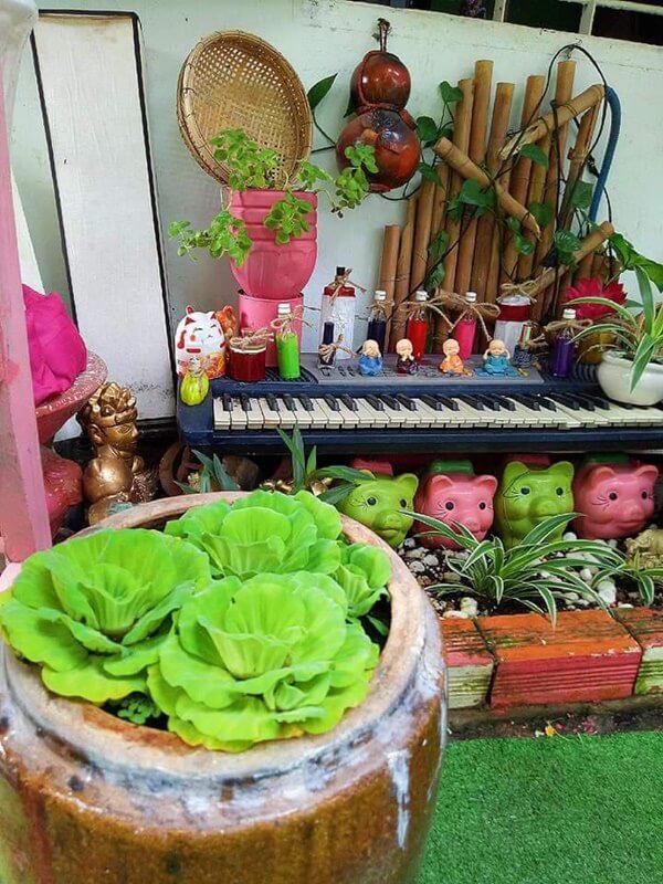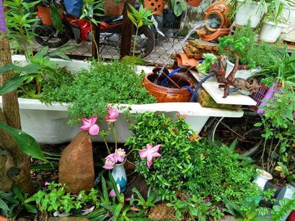 Đặc biệt hơn, tất cả vật dụng, đồ trang trí trong vườn đều 1 tay chị làm bằng những thứ vứt đi. Ví dụ như xích đu ở góc vườn chị làm bằng vỏ xe cũ. Chuồng bồ câu cũng do chị tự đóng và sơn sửa. Bồn tắm cũ được chị biến thành chậu hoa, đặt cạnh chiếc chum làm thác nước chảy…