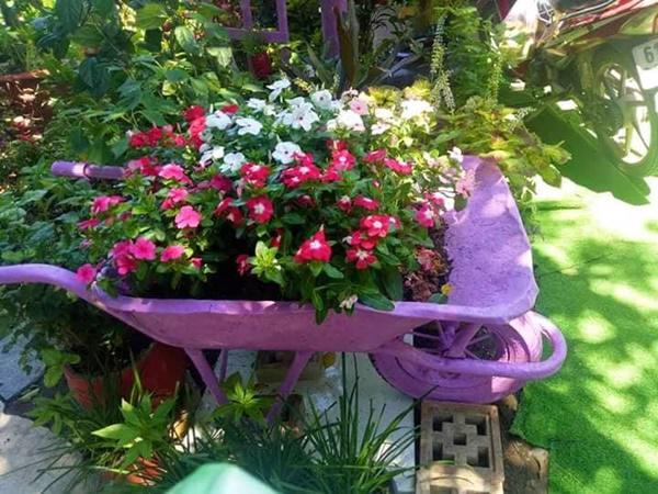 Chiếc xe rùa bỏ đi được chị mang ra trồng hoa dừa.