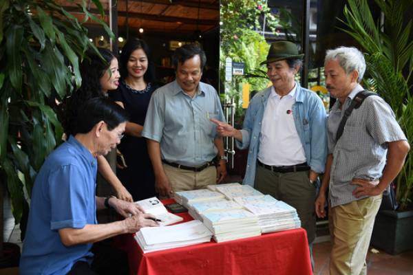 Nhà thơ Nguyễn Ngọc Hạnh ký tặng tập thơ tại buổi ra mắt ở Hà Nội