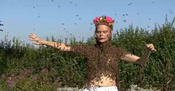 Người phụ nữ được mệnh danh là nữ hoàng ong khi thản nhiên ở trần rồi để 12000 con ong đậu kín người.