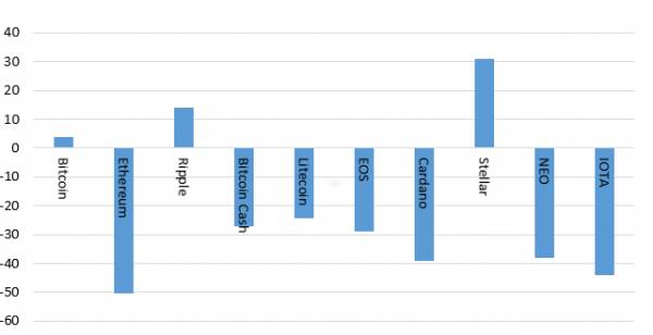 Kể từ ngày 1/7, 7 trong số 10 đồng tiền mật mã lớn nhất tiếp tục giảm sâu hơn, với Ether là kẻ thua cuộc lớn nhất khi rớt đến 50,4%. Nếu tính theo mức thấp nhất, thì đồng tiền mật mã chạy trên nền tảng blockchain ethereum này đã giảm gần 90% so với mức cao nhất từ lâu nay. Có thời điểm đồng Ether đã đánh mất vị trí đồng tiền mật mã lớn thứ hai vào tay đồng XRP - một trong những đồng tiền mật mã có hiệu suất tốt nhất trong quý 3.