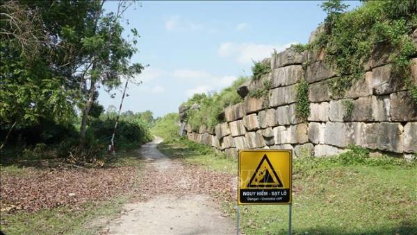 Đặt biển cảnh báo giao thông sạt lở đá trên đường tại một điểm có đoạn tường thành Di sản thế giới Thành nhà Hồ. Ảnh: Hoa Mai/TTXVN