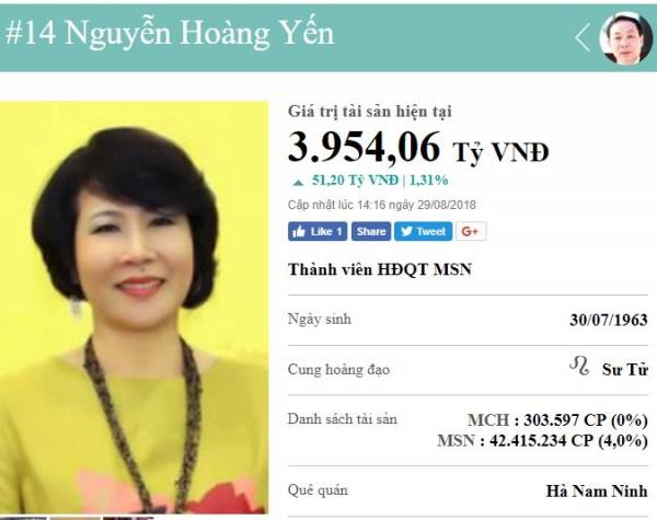 Trong danh sách top những người giàu nhất Việt Nam trên sàn chứng khoán tính đến ngày 29/8, bà Nguyễn Hoàng Yến đứng ở vị trí thứ 14 với 3.962,7 tỷ đồng, do sở hữu 42.415.234 cổ phiếu của Tập đoàn Masan.