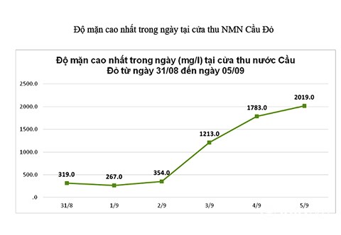 Theo đó, trong những ngày vừa qua, do thời tiết nắng nóng kéo dài cộng với lượng nước thượng nguồn về ít dẫn đến tình trạng nguồn nước sông Cầu Đỏ bị nhiễm mặn làm ảnh hưởng đến tình hình cấp nước cho TP Đà Nẵng. Cụ thể, từ ngày 31/8 đến nay, nguồn nước thô tại cửa thu NMN Cầu Đỏ bị nhiễm mặn, độ mặn thường xuyên dao động ở mức 260 – 2.000 mg/l. Độ mặn cao nhất là 2.019 mg/l lúc 09h00 ngày 5/9 (tiêu chuẩn nước sinh hoạt là 250 mg/l).