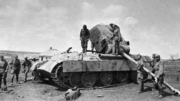Lính Hồng Quân kiểm tra một chiếc tăng Panther của quân Phát xít Đức bị bắn hạ